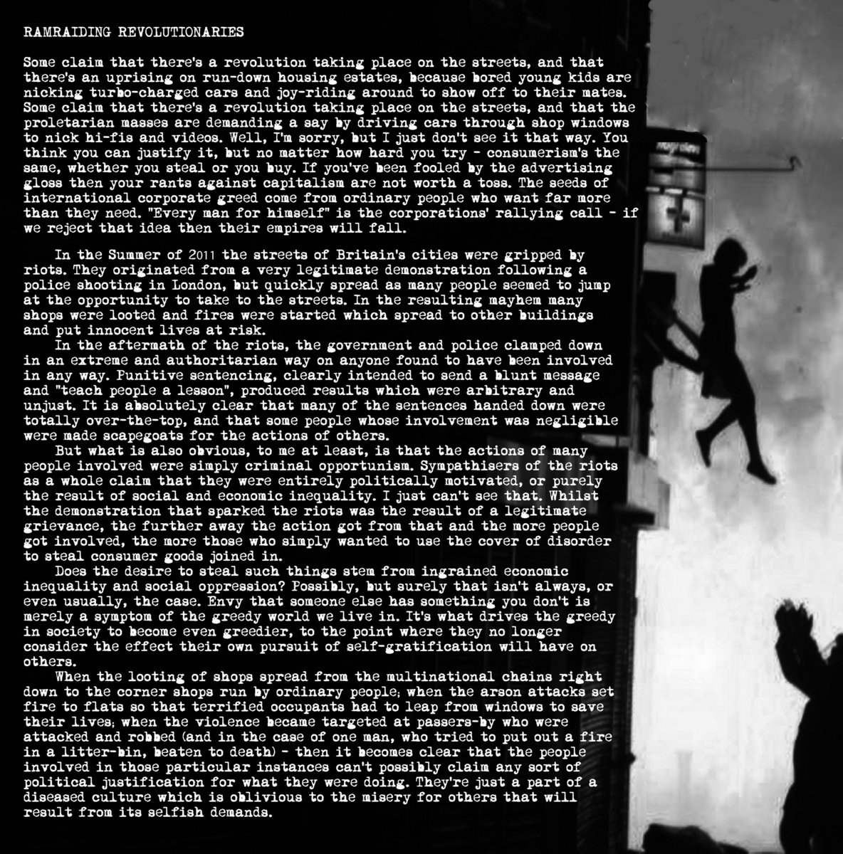 When the looting of shops spread from the multinational chains right down to the corner shops run by ordinary people; when the arson attacks set fire to flats so that terrified occupants had to leap from windows to save their lives; when the violence became targeted at passers-by who were attacked and robbed (and in the case of one man, who tried to put out a fire in a litter-bin, beaten to death) - then it becomes clear that the people involved in those particular instances can’t possibly claim any sort of political justification for what they were doing. They’re just a part of a diseased culture which is oblivious to the misery for others that will result from its selfish demands.
